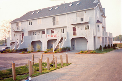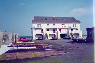 This is what it looked like when Bob and I came to check out 8339 in 1989, which was a model at the time, along with 8337. You can see the construction trailer on the right. Strangely enough, there is a "SOLD" sign on one waterview unit which was only a concrete foundation at the time. Initially, our front doors were burgundy, but the gray with white trim prevails to this day. |