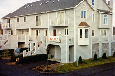 The four waterview units. In the forefront, we no longer have the 10 posts pictured here. They were replaced with the pilings/rope we now have. Notice that we used to have life rings to the right of each front door. And that scraggly little tree is no longer in front of 8342. The landscaping leaves a lot to be desired. |